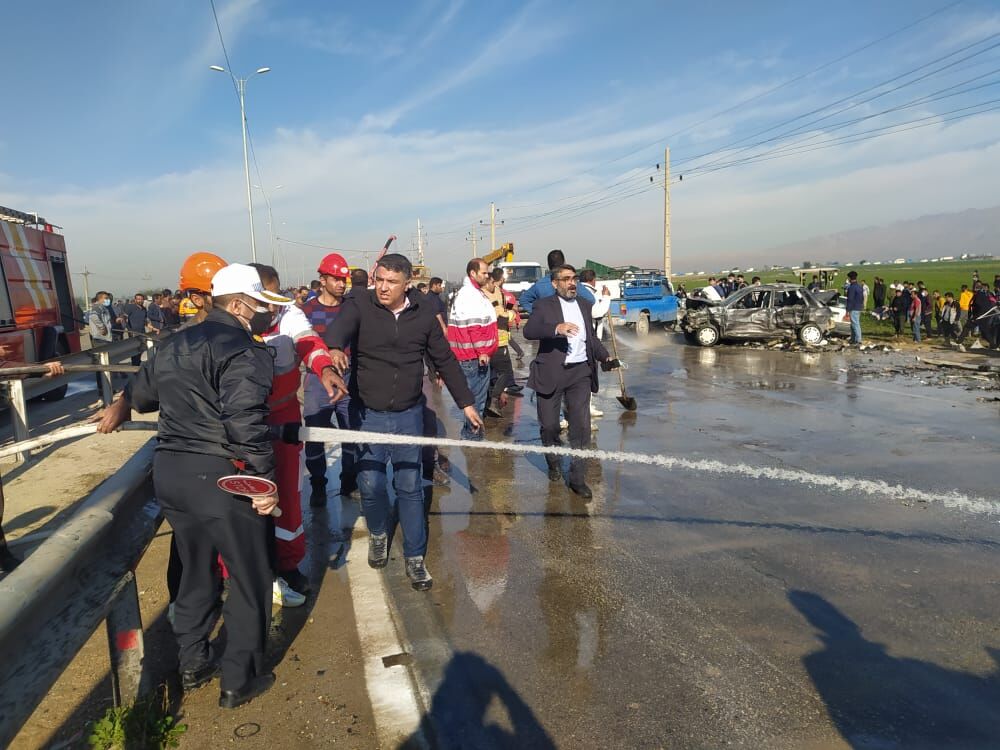 در این تصادف زنجیره ای چند دستگاه خودرو دچار آتش سوزی شدند.