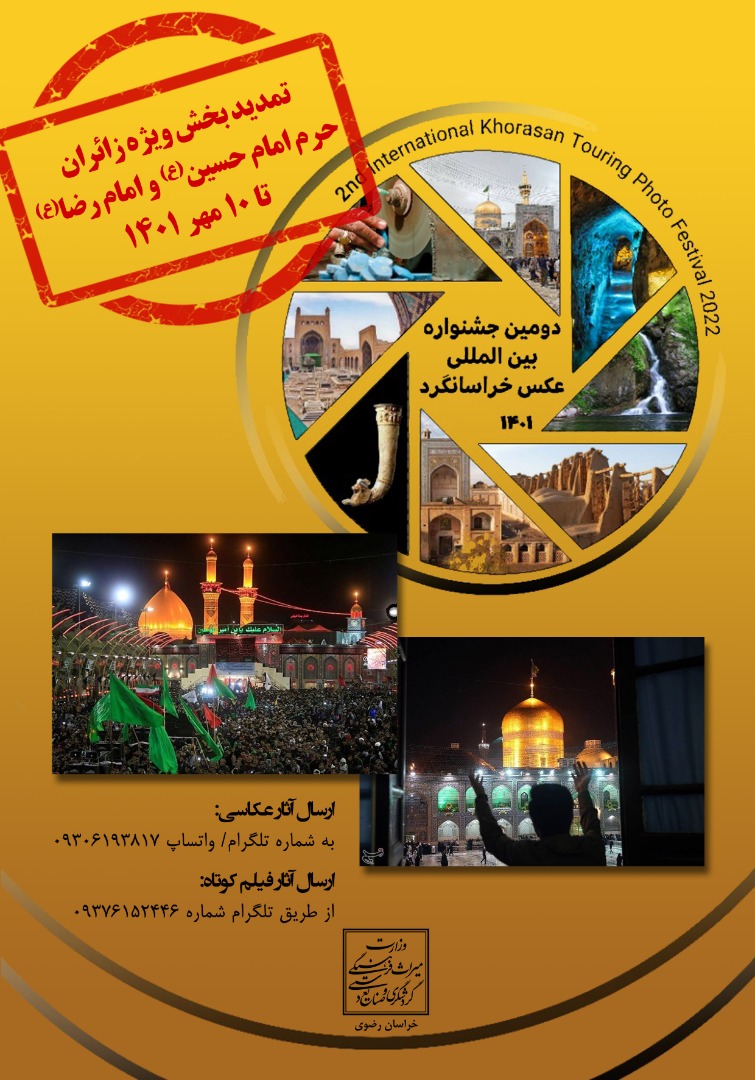 به گزارش تابناک رضوی سعید برزگر با اعلام این خبر افزود: «با توجه به استقبال هنرمندان عکاس و فیلمساز از این جشنواره و با توجه به اینکه این روزها مصادف با دهه پایانی صفر است و زائران پیاده زیادی به کربلا و حرم مطهر امام حسین ( ع) و حرم مطهر امام رضا (ع) مشرف میشوند، با هدف تصویربرداری و مستندسازی مراسم پرشور معنوی دهه پایانی صفر، تمدید این جشنواره فقط در این بخش تا تاریخ دهم مهرماه ۱۴۰۱ از سوی کمیته برگزاری جشنواره تصویب شد.»