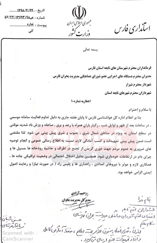 ستاد مدیریت بحران استان فارس در نامهای به فرمانداران، مدیران اجرایی و و شهرداران شهرهای مختلف فارس نسبت به باران های موسمی و وقوع سیل هشدار داد و خواستار آمادگی دستگاه های مربوطه شد.